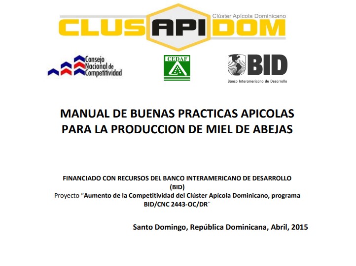 Manual elaborado por el Dr. Óscar García Suárez, como parte de un proyecto en República Dominicana financiado por el Banco Interamericano de Desarrollo (BID), en donde se abordan diversos temas de la producción de miel, como la caracterización de la miel, condiciones que debe reunir una colmena, ubicación e instalación de apiarios, manejo, cosecha, contaminación cruzada, personal, programa de limpieza y desinfección, cera estampada y paneles almacenados, y rastreabilidad.