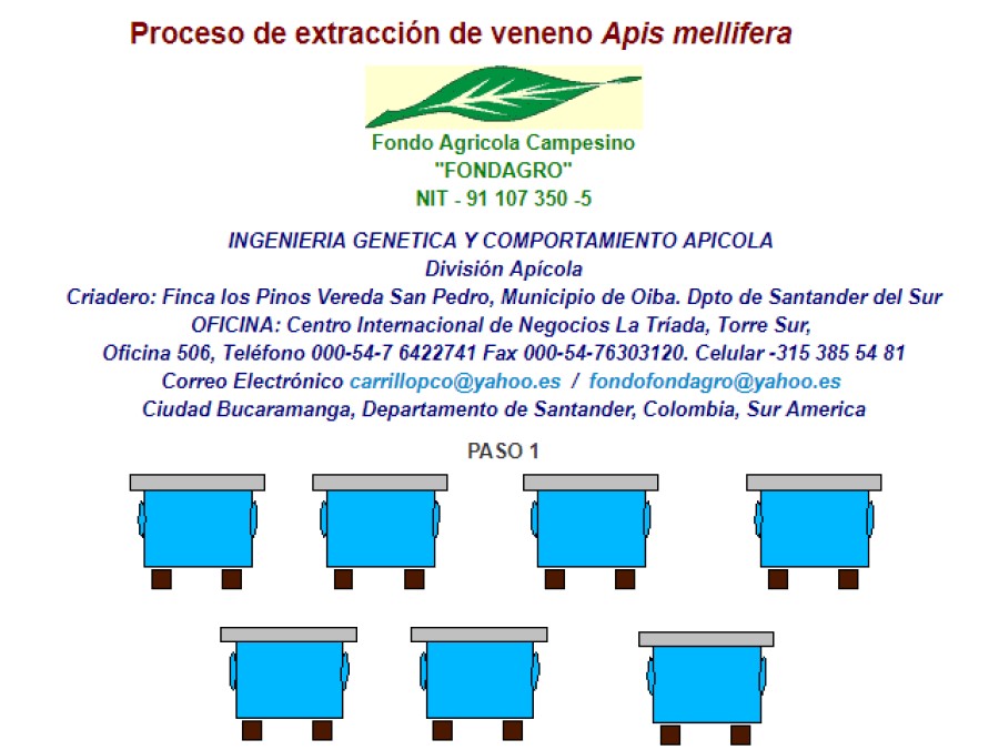 En este sitio se explica un método creado por la empresa colombiana FONDAGRO para extraer y recolectar el veneno de las abejas, el cual es usado en la Apiterapia.