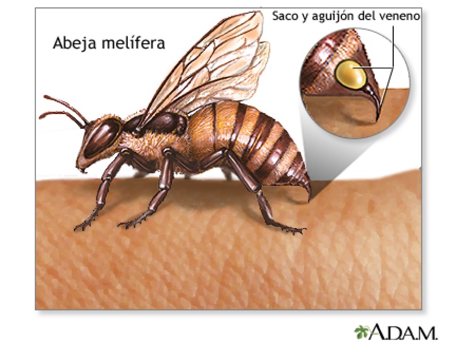 Este artículo de una enciclopedia médica habla sobre el veneno de abejas, las reacciones alérgicas, los síntomas, cuidados que se deben dar ante una picadura y las expectativas o pronósticos.
